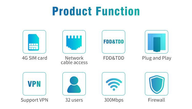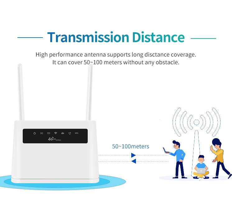 És un encaminador WiFi CAT 4 4G de velocitat de transmissió de fins a 300 Mbps, velocitat 4G de fins a 150 Mbps, TDD-LTE: 150Mbps DL / 50Mbps UL TD-SCDMA: 2,8Mbps DL / 2,2Mbps UL. El terminal pot suportar tres modes de comunicació: TDD FDD, WCDMA. Admet el mode de treball d'accés a Internet/PPPoE, utilitza una targeta SIM 4G, es pot connectar al mòdem com a mode de passarel·la, equipat amb 4 interfícies LAN, es pot connectar a altres dispositius simultàniament. És fàcil de connectar i fàcil de portar a la mà. Compartiu el client amb 32 usuaris de WiFi, només cal que introduïu la targeta SIM i podreu gaudir del WiFi amb aquest encaminador portàtil 4G LTE.