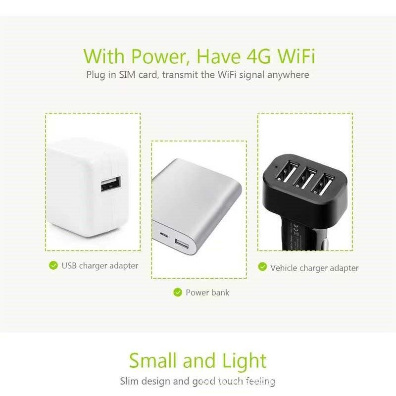 Compartint la connexió a Internet, fins a 10 usuaris poden accedir a la xarxa Wi-al mateix temps. No cal instal·lar programari (mode WiFi), treballar amb font d'alimentació externa, sense temps de treball limitat.